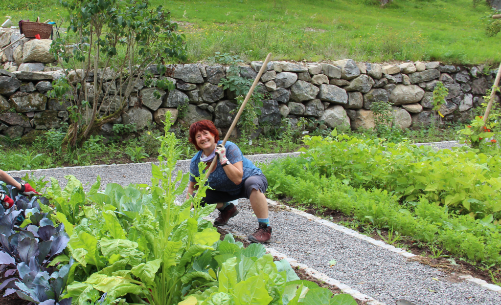 Mit angepackt: Frau Schüle unterstützte im Namen des Bauerngarten- und Wildkräuterland Baden e.V. sowie als erfahrene Gartenpädagogin des internationalen United World College (UWC) Bosch die Reaktivierung des Altbirkle-Gartens. Foto: S. Köllner